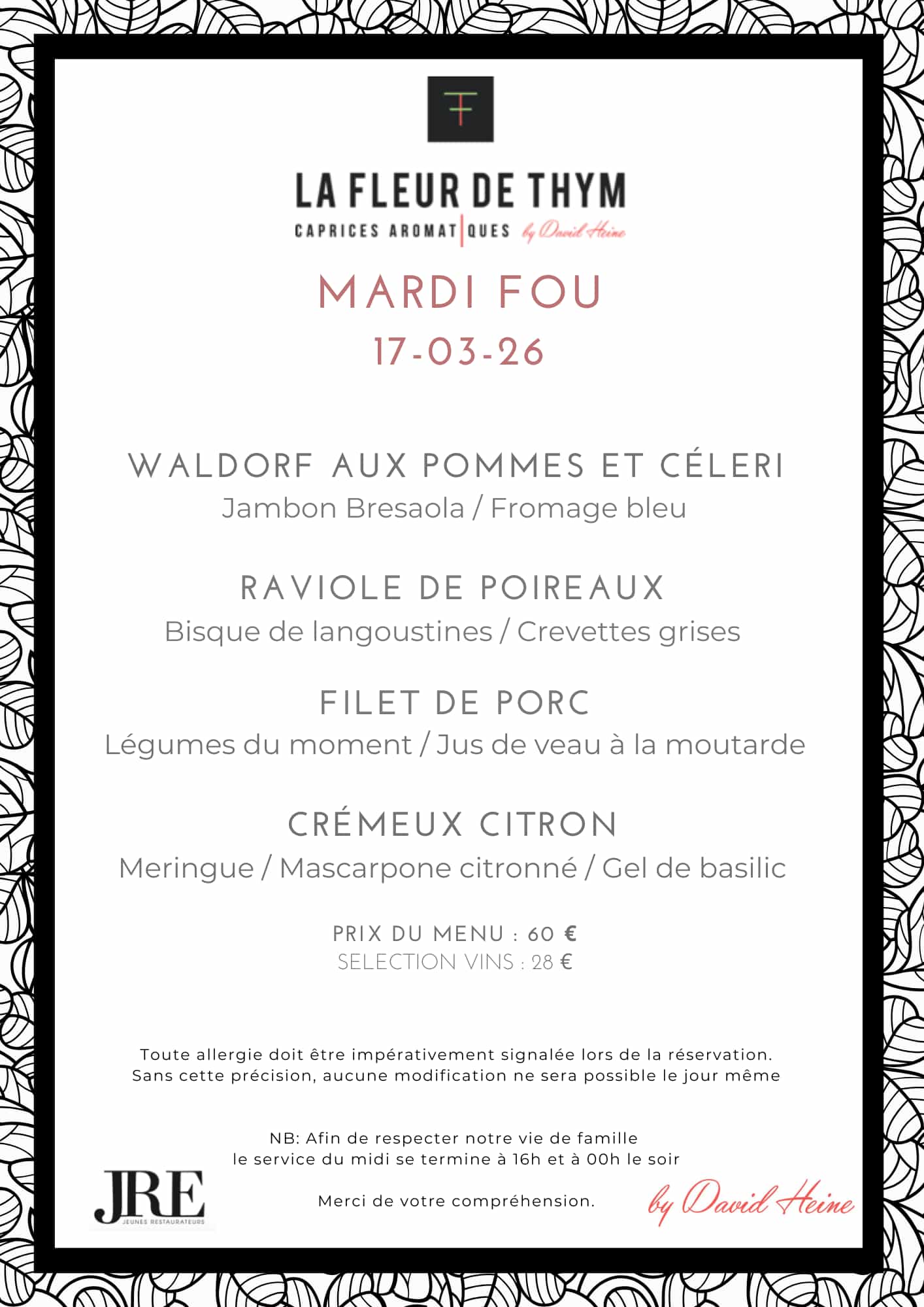 Le mardi, nous servons uniquement le menu "Mardi Fou", midi et soir.