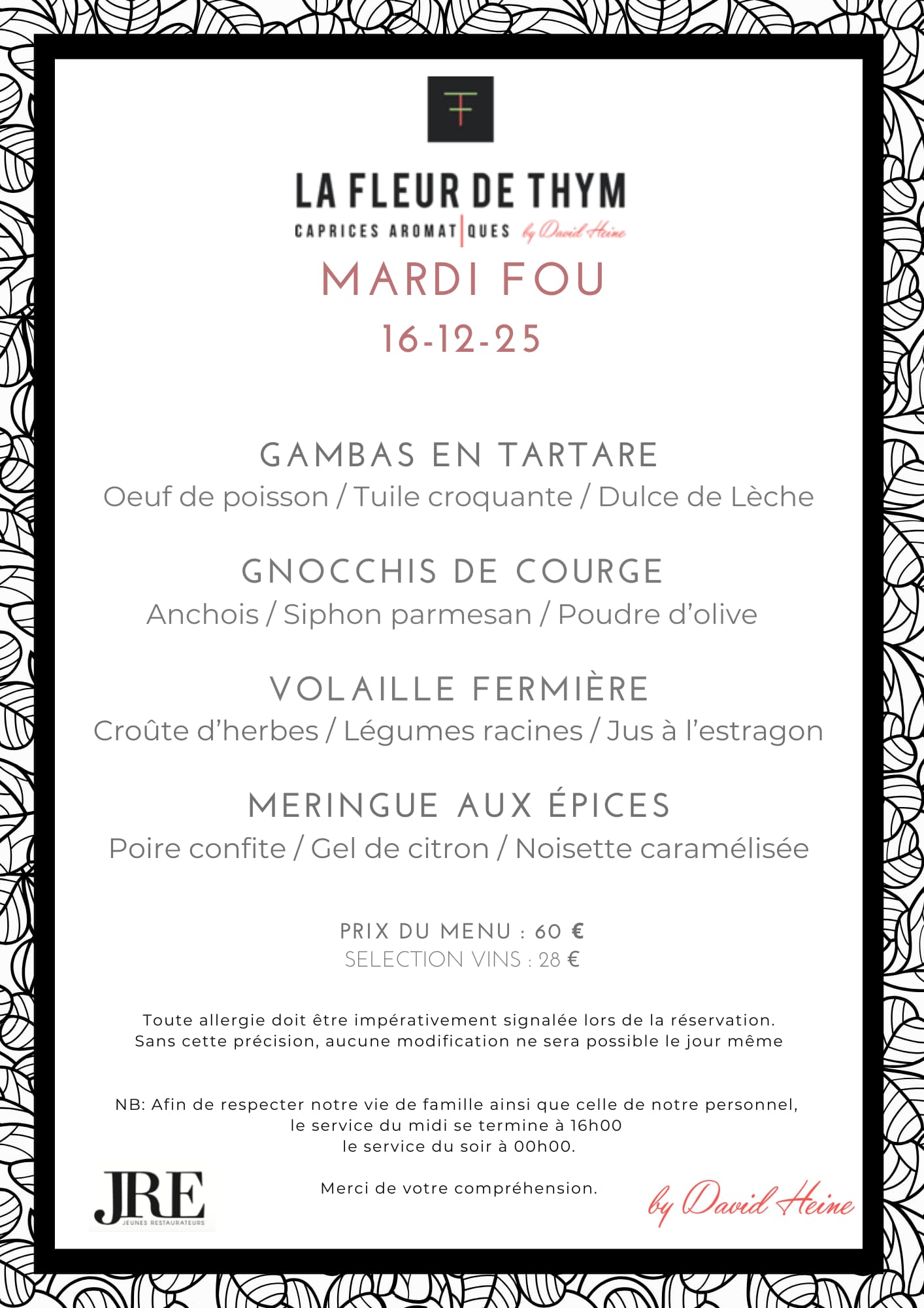 Le mardi, nous servons uniquement le menu "Mardi Fou", midi et soir.